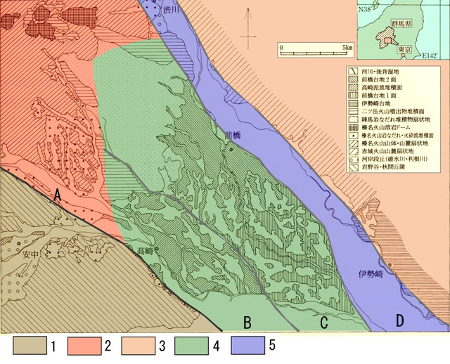 A 深谷断層系(烏川断層) B 烏川・井野川帯 C 前橋台地帯 D 広瀬川帯