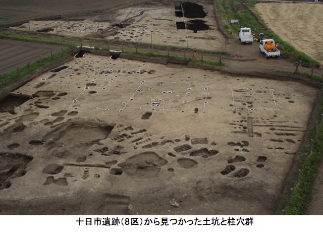 8区と呼ばれる調査区では数棟の掘立柱建物と墓坑が見つかりました。建物群の年代は、土坑に埋