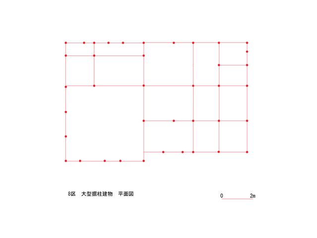 大型建物の柱間を修正して作成した平面図です。柱に囲まれた複数の空間が見られます。