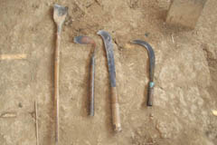 右から鉄鎌(レト)、伐採用の鉈鎌、草かき鎌(ミャシュー)、播種にも利用する掘り具。
