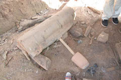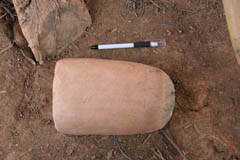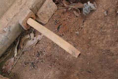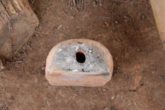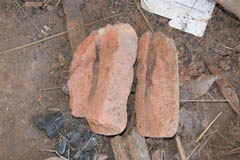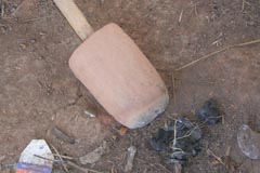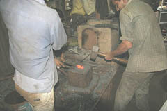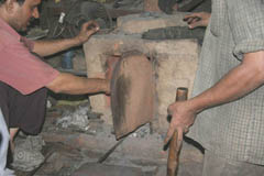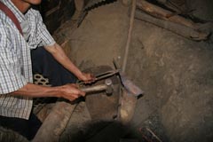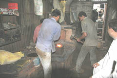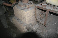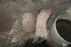 鍛冶場 鍛冶場は、集落内に1軒のみで上屋が存在する。鍛冶屋は、父親と息子が経営する。床面に鍛冶炉があり、鞴は木製の筒型の鞴で横置きで使用する。送風管は木製管で羽口とは接合していない。羽口は赤褐色のシルト質粘土で作られた土製羽口(現地の言葉でミチャー)である。南北折衷系鍛冶技術。