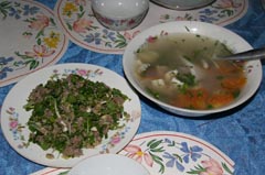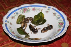 上から、揚げた川海苔カイ・ペーン、ルアンパバーン・ソーセージ、筍のフライ(ルアンパバーン・パークファイミーサイ)
