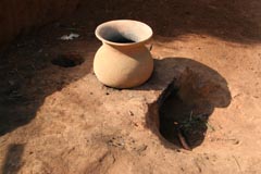 住居の周囲に置かれた土器は、糸の染色に煮沸具として使用する。野外にあるかまどとその使用例(ウドムサイ郊外18km村ルー族)